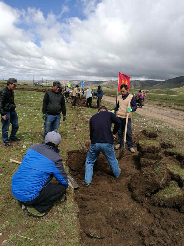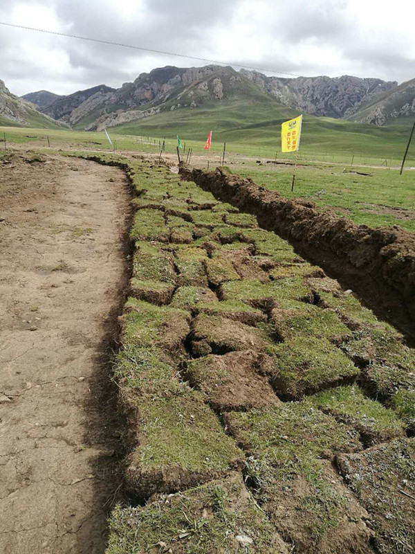 綠色工程作為唐花路建設(shè)的重中之重,在綠化施工方面,指揮部采用就近移栽的方式,及時將紅線內(nèi)和臨時用地的草甸按規(guī)范移植至道路邊坡,盡量保留自然的原貌,為了避免施工機(jī)械直接碾壓稀少的草甸,就近利用空地堆放揭開的草墊,并在堆放點設(shè)置標(biāo)示、標(biāo)牌,及時灑水養(yǎng)護(hù),有效保證草墊的存活率,目前移栽的草墊綠化率和存活率均達(dá)到90%以上。公路邊坡的恢復(fù)、綠化工作截至2018年7月底已完成 90%,11月底將全部完成。