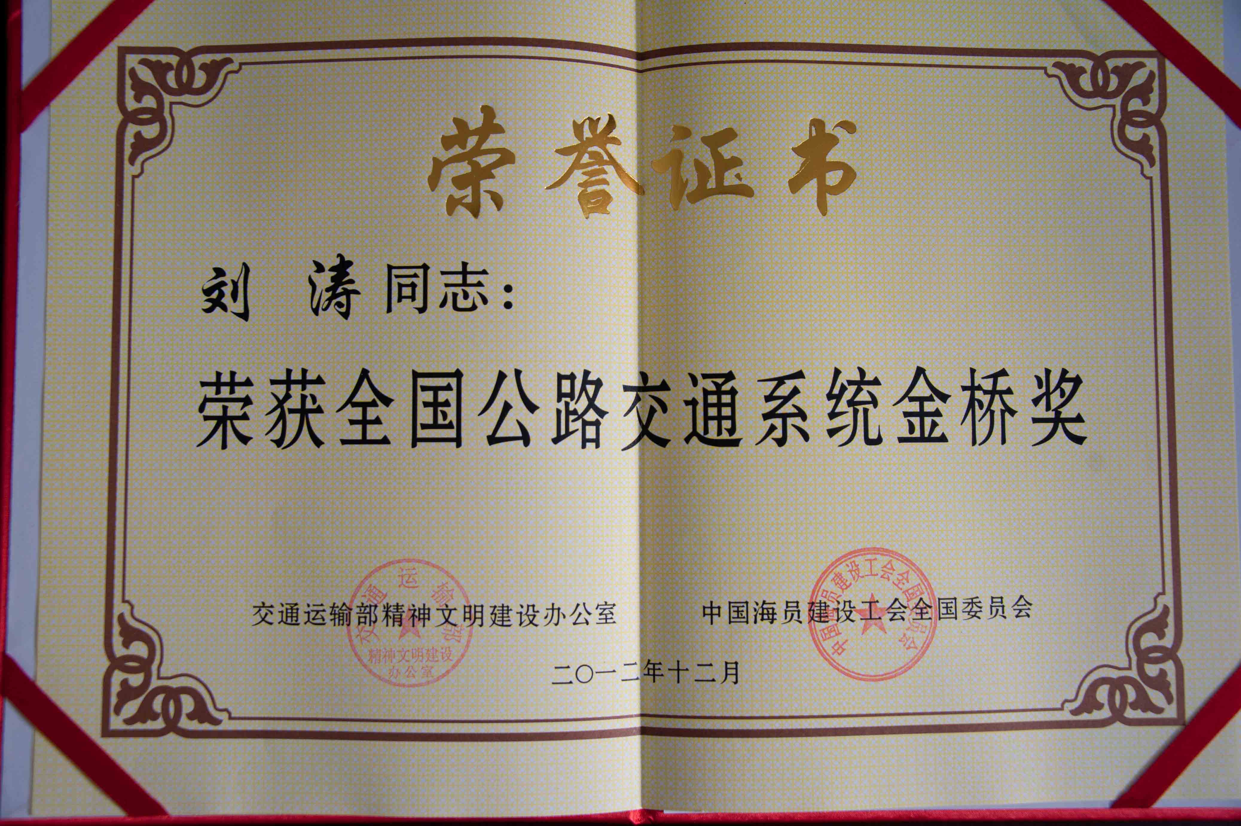 劉濤同志獲“全國公路交通系統(tǒng)金橋獎”