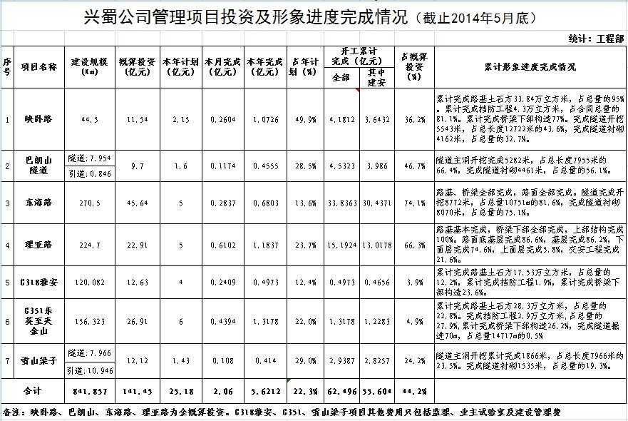 公司管理項目投資及形象進度完成情況(截至2014年5月底)
