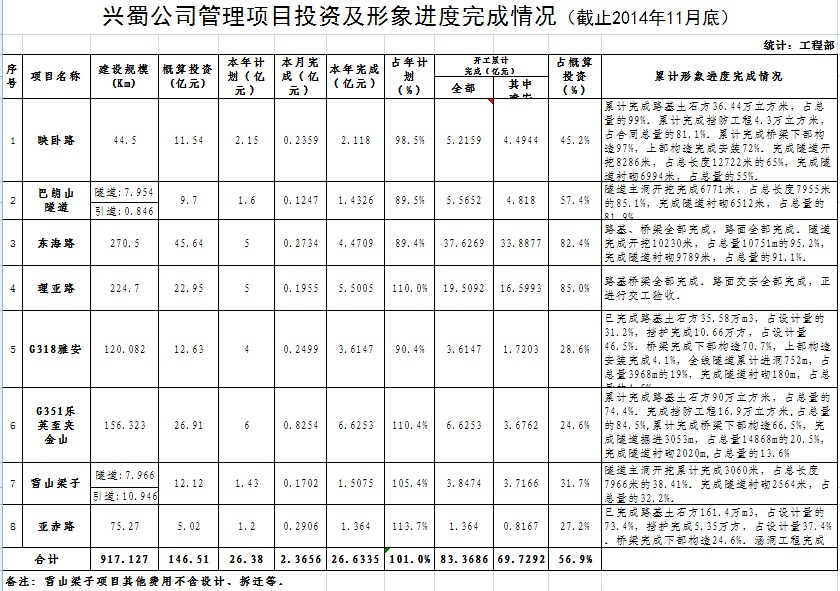 公司管理項(xiàng)目投資及形象進(jìn)度完成情況(截止2014年11月底)