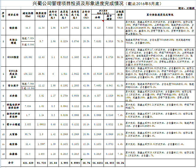 興蜀公司管理項目投資及形象進度完成情況(截止2016年5月底)