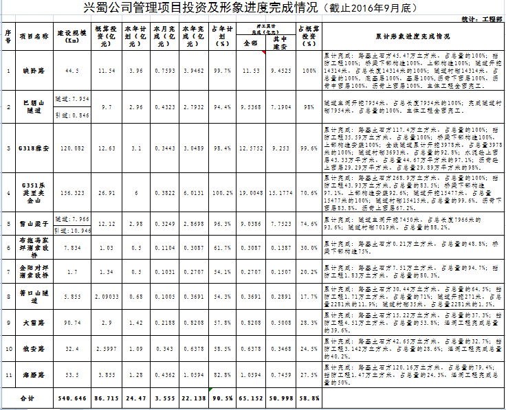 興蜀公司管理項(xiàng)目投資及形象進(jìn)度完成情況(截止2016年9月底)