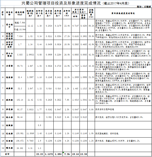 興蜀公司管理項(xiàng)目投資及形象進(jìn)度完成情況(截止2017年4月底)