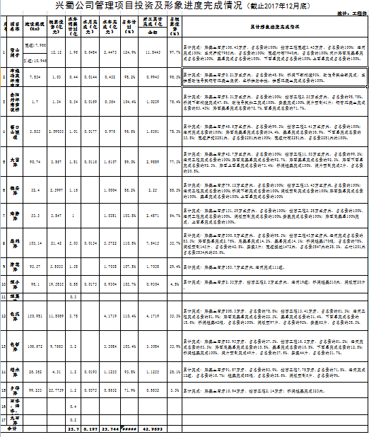 興蜀公司管理項目投資及形象進(jìn)度完成情況(截止2017年12月底)
