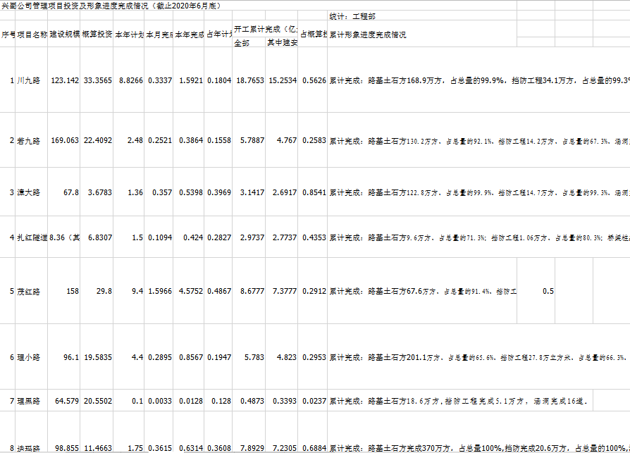 興蜀公司管理項(xiàng)目投資及形象進(jìn)度完成情況(截至2020年6月底)