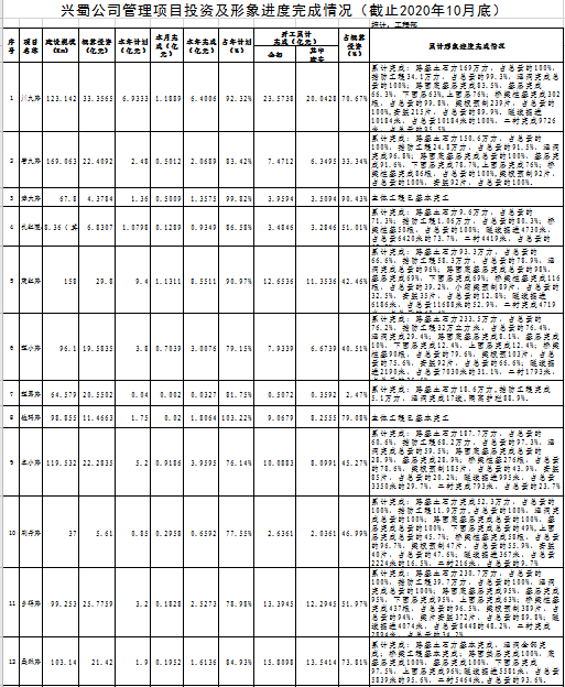 興蜀公司管理項目投資及形象進度完成情況(截至2020年10月底)