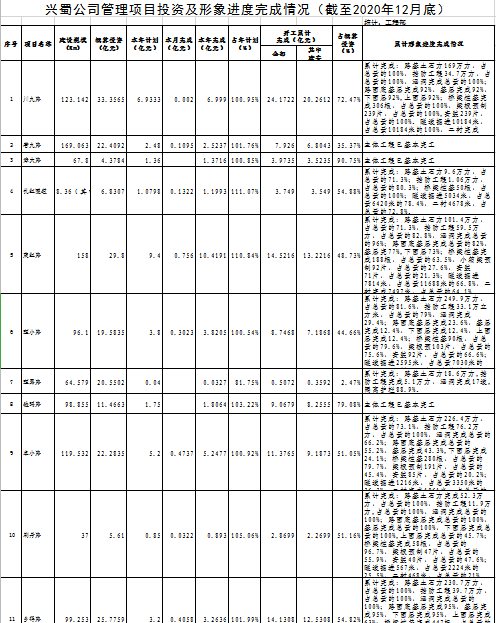 興蜀公司管理項(xiàng)目投資及形象進(jìn)度完成情況(截止2020年12月底)