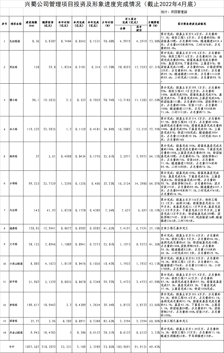 興蜀公司管理項目投資及形象進度完成情況(截止2022年4底)