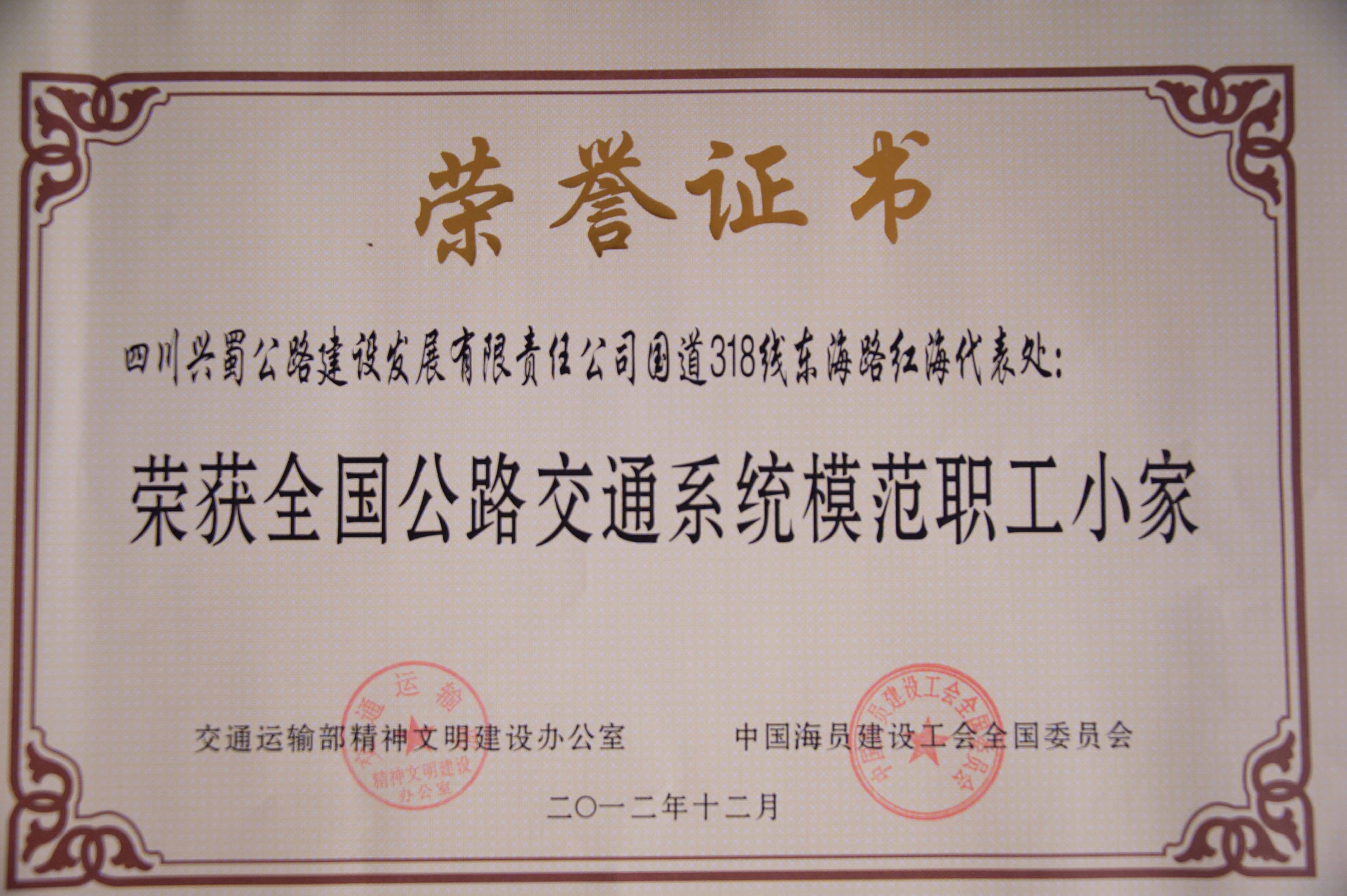 日前,交通運輸部精神文明建設辦公室和中國海員建設全國工會聯(lián)合授予公司國道318線東海路紅海代表處“全國公路交通系統(tǒng)模范職工小家”