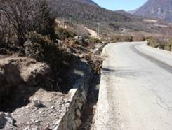 TJ4標(biāo)K223+320-K223+440段,由于河面較寬,設(shè)計(jì)擋墻與既有擋墻緊貼,施工中容易造成既有干砌片石擋墻的垮塌,不利于施工作業(yè)人員的安全,保通任務(wù)也很繁重。為此,香格里拉代表處要求將擋墻外移1米,擋墻頂面降低60公分,日后再將其以弧面形式回填種植土,種植花草、矮灌的設(shè)計(jì)。讓過(guò)往的游客看不到高大聳立的擋墻,減少了臨邊臨河的危險(xiǎn)。將五顏六色的花帶引入公路旁,讓“游客行徑在鮮花叢中”是我們的夢(mèng)想。