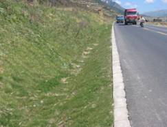 全線漿砌片石、砼邊溝、排水溝的原有設(shè)計(jì),既增加了工程造價(jià),又不利于公路與周邊環(huán)境的自然天成。為此,省道216\217理亞路指揮部、設(shè)計(jì)院等多次積極與參建單位針對(duì)該項(xiàng)目特點(diǎn)進(jìn)行研究探索并實(shí)地踏勘,確定了在原水溝以下加設(shè)縱向盲溝達(dá)到排水目的,在除設(shè)置有上擋的段落保留砼邊溝外,其余段落均設(shè)置成淺蝶形土溝的設(shè)計(jì),并在其上鋪設(shè)草皮,以減少人工痕跡,讓公路自然天成,與周圍環(huán)境渾然一體。