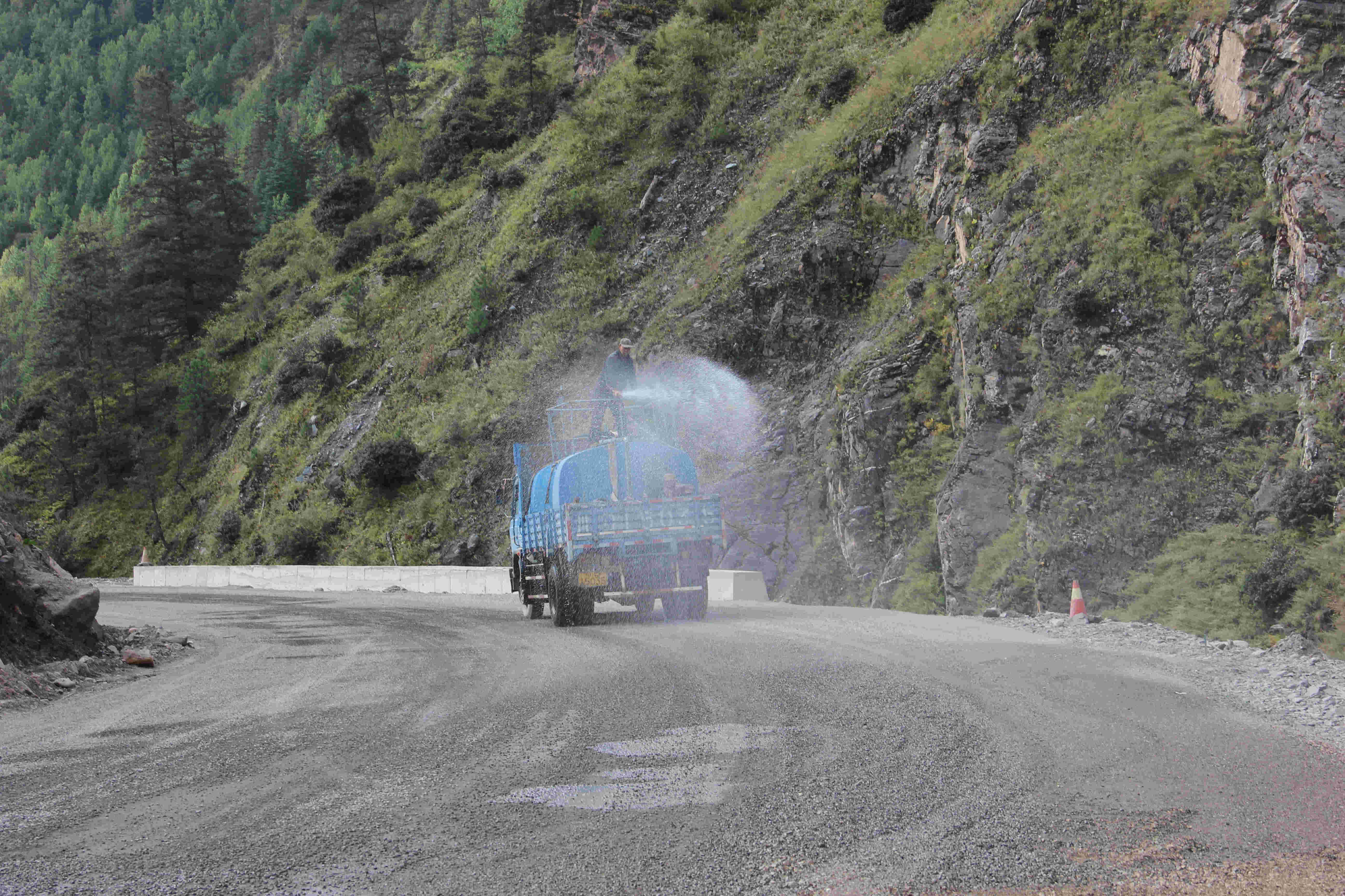 為完成機場通航任務,確保省委工作組、州委州政府各級領導及媒體記者團能安全舒適的通過理亞路沿線,理亞路指揮部對全線保通工作進行了詳細的部署安排,制定了相應的保通方案和措施,為亞丁機場精彩亮相保駕護航:一是對沿線K225段邊坡松動滑坡點進行及時處置,預留出緩沖避險區(qū),設置安全警示標識,安排保通人員駐守,并于9月15日消除了該段的安全隱患;二是對沿線已半幅鋪設瀝青混凝土下面層段的接頭處進行了平穩(wěn)過渡處置,保證車輛順暢通行;三是在9月16日當天安排灑水車、灌車對鋪設級配碎石墊層段落進行定點定時分段灑水降塵,保證路面濕潤度,并在沿線有回頭彎等行車視線較差路段安排保通人員進行引導,所有保通人員佩戴對講機,保證及時溝通,消除了揚塵所帶來的行車安全隱患。