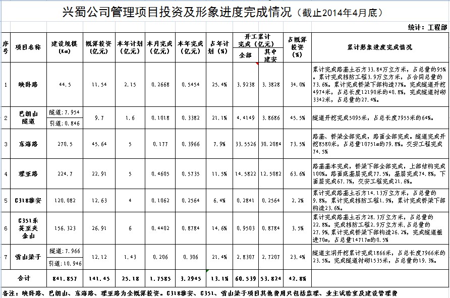 公司管理項目投資及形象進度完成情況(截至2014年4月底)