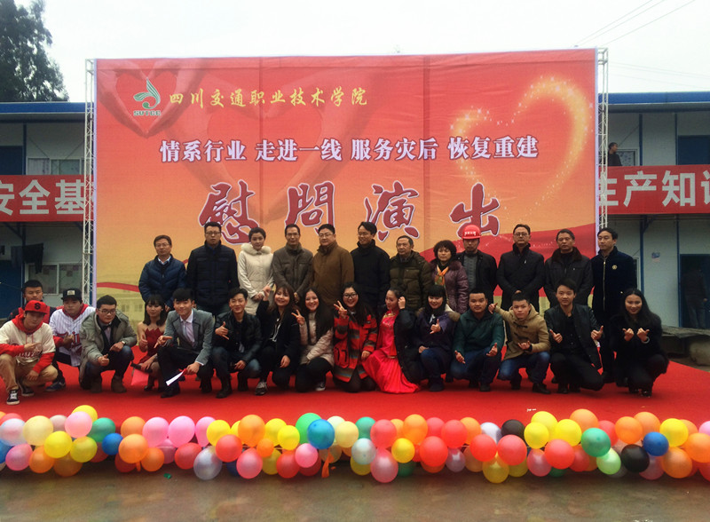 1月8日,四川交通職業(yè)技術(shù)學(xué)院全體師生員工為表達(dá)對蘆山地震災(zāi)區(qū)災(zāi)后恢復(fù)重建項目的關(guān)注和支持,對長期奮戰(zhàn)在災(zāi)后恢復(fù)重建戰(zhàn)場上的參建職工的關(guān)心和崇敬,豐富和活躍春節(jié)期間廣大建設(shè)者的文化生活,特地組建了慰問演出文藝小分隊,來到興蜀公司雅安國道351線、318線的災(zāi)后恢復(fù)重建現(xiàn)場進(jìn)行“情系行業(yè)、走進(jìn)一線、服務(wù)災(zāi)后恢復(fù)重建”慰問演出,受到一線參建者們的熱烈歡迎。