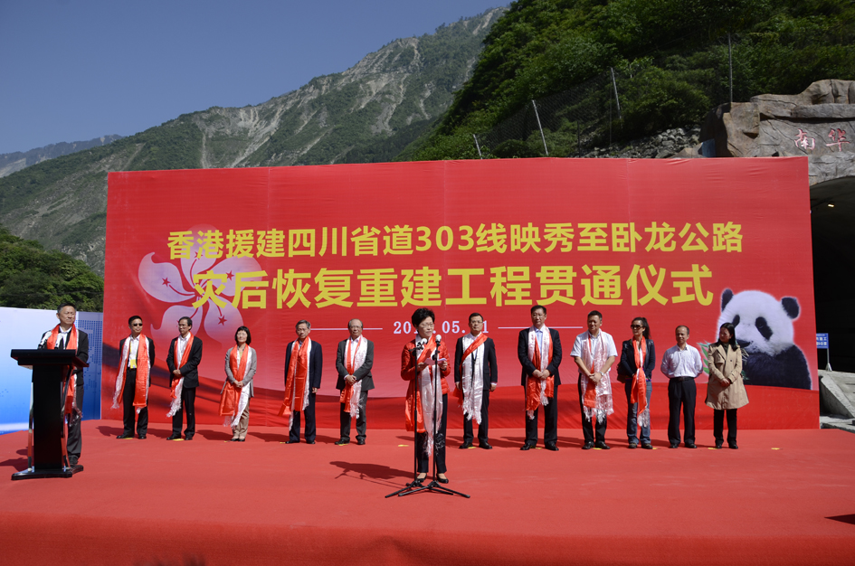 2016年5月11日,由香港特區(qū)援建的省道303線映(秀)臥(龍)路貫通儀式在南華隧道入口處舉行。香港特別行政區(qū)政務(wù)司司長林鄭月娥出席儀式,省政府副秘書長趙衛(wèi)平宣布貫通,廳黨組成員、總工程師陳樂生主持儀式。