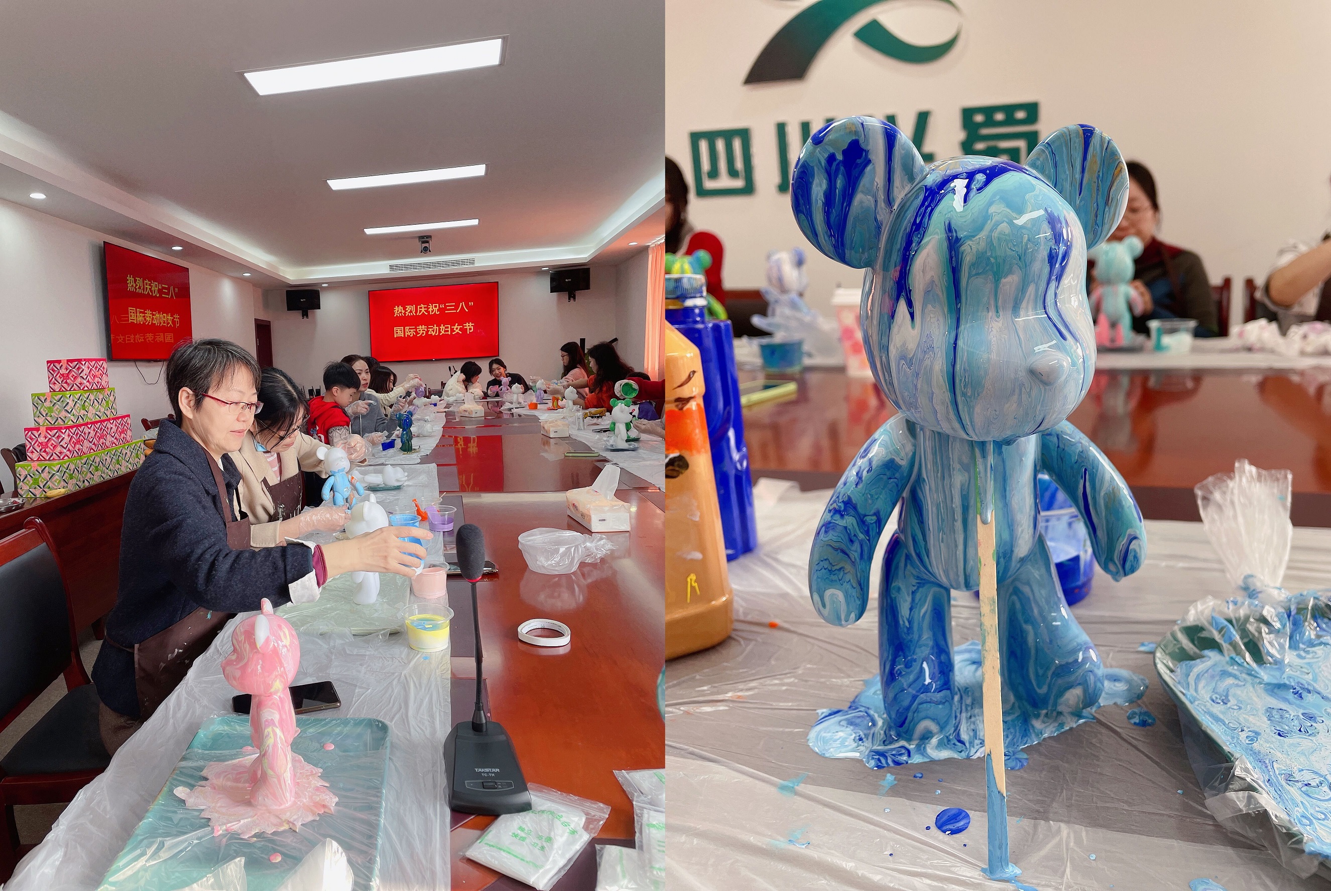 活動現(xiàn)場,老師一邊講解一邊進(jìn)行演示,讓大家詳細(xì)了解DIY手工的制作過程。隨后女職工們自行挑選喜歡的顏色開始制作,制作過程中大家互相幫助,有說有笑,活動氛圍十分融洽。最后,在大家的努力下,精美的流體小熊制作完成。
