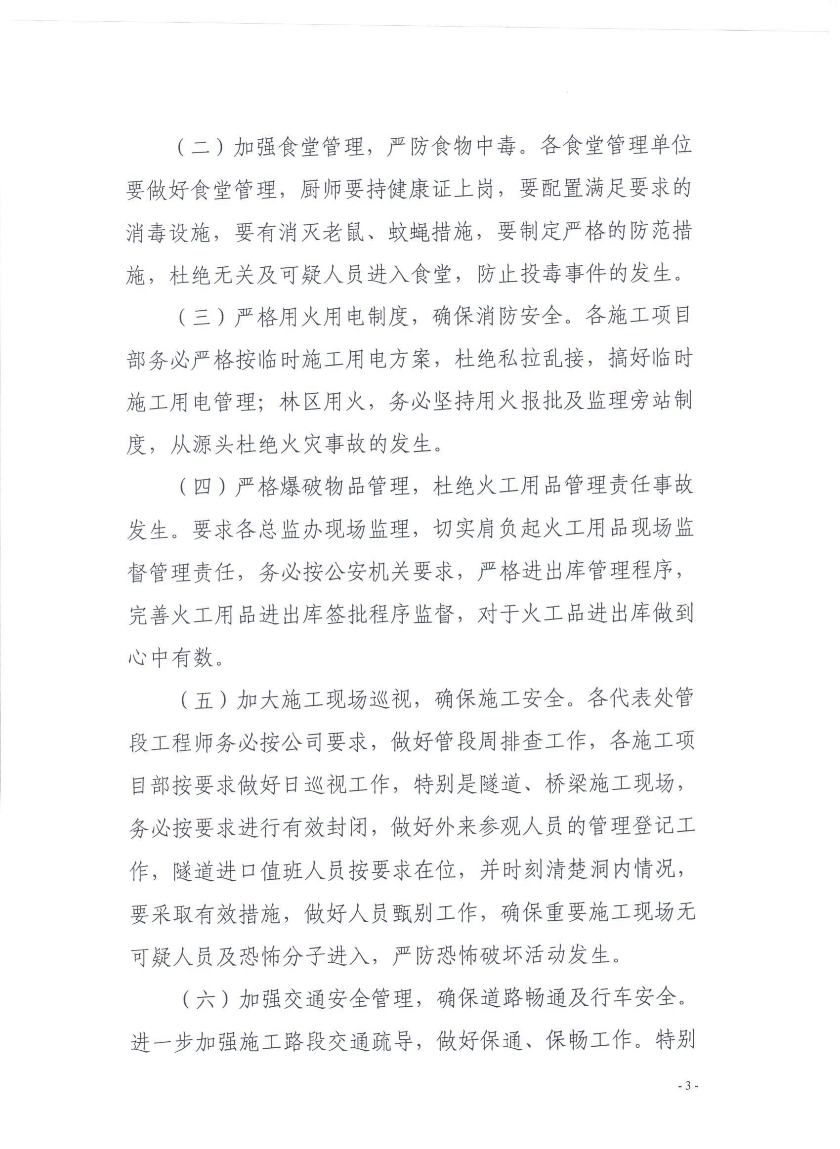 (五)加大施工現(xiàn)場巡視,確保施工安全。各代表處管段工程師務必按公司要求,做好管段周排查工作,各施工項目部按要求做好日巡視工作,特別是隧道、橋梁施工現(xiàn)場,務必按要求進行有效封閉,做好外來參觀人員的管理登記工作,隧道進口值班人員按要求在位,并時刻清楚洞內(nèi)情況,要采取有效措施,做好人員甄別工作,確保重要施工現(xiàn)場無可疑人員及恐怖分子進入,嚴防恐怖破壞活動發(fā)生。