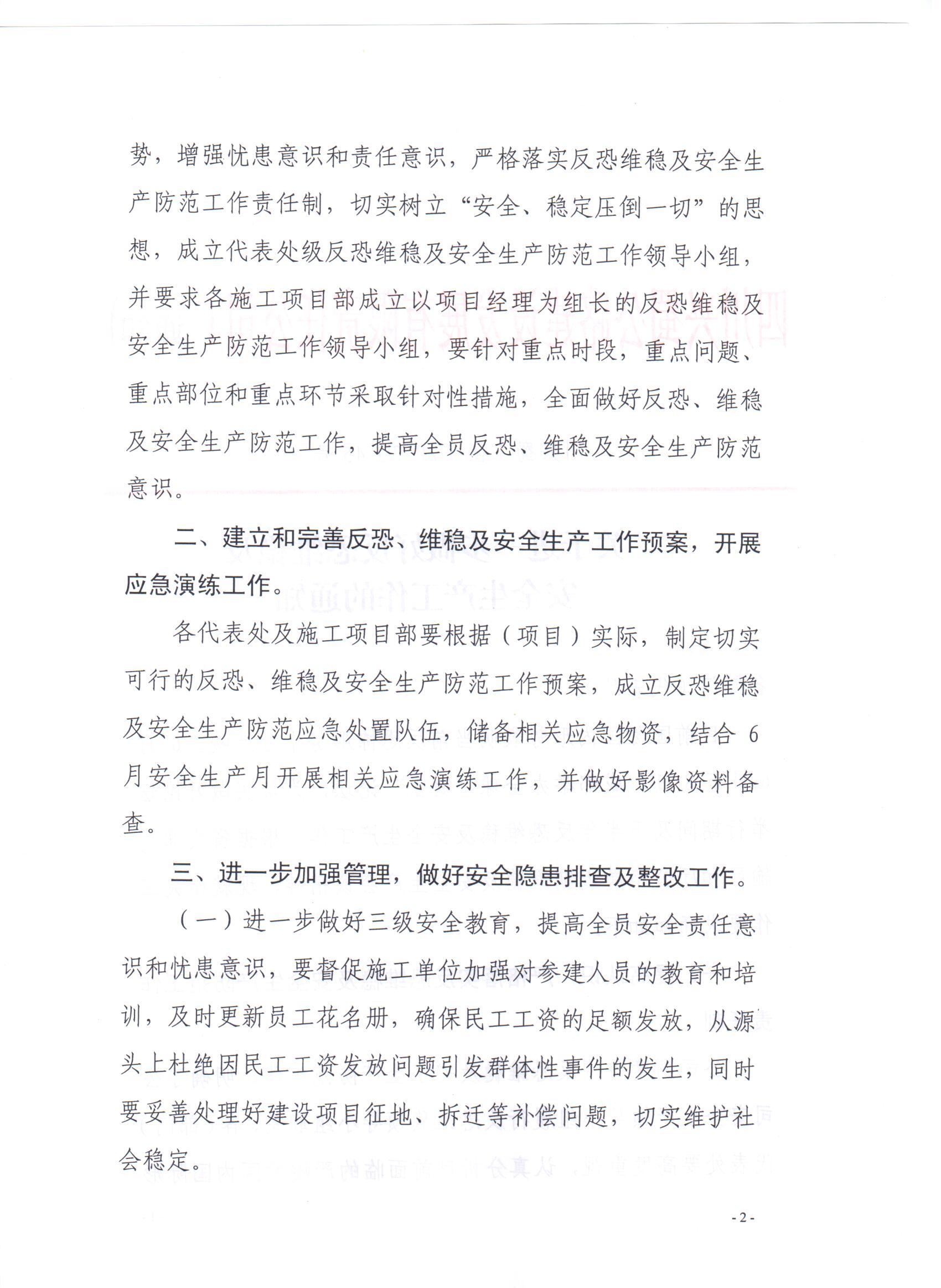 公司高度重視反恐維穩(wěn)及安全生產(chǎn)防范工作,明確了公司安全生產(chǎn)領(lǐng)導小組履行反恐維穩(wěn)領(lǐng)導小組職責,各(部門)代表處要高度重視,認真分析目前面臨的嚴峻的國內(nèi)國際形勢,增強憂患意識和責任意識,嚴格落實反恐維穩(wěn)及安全生產(chǎn)防范工作責任制,切實樹立“安全、穩(wěn)定壓倒一切”的思想,成立代表處級反恐維穩(wěn)及安全生產(chǎn)防范工作領(lǐng)導小組,并要求各施工項目部成立以項目經(jīng)理為組長的反恐維穩(wěn)及安全生產(chǎn)防范工作領(lǐng)導小組,要針對重點時段,重點問題、重點部位和重點環(huán)節(jié)采取針對性措施,全面做好反恐、維穩(wěn)及安全生產(chǎn)防范工作,提高全員反恐、維穩(wěn)及安全生產(chǎn)防范意識。