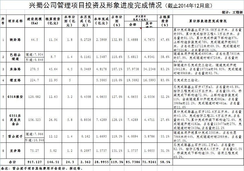 公司管理項目投資及形象進(jìn)度完成情況(截止2014年12月底)