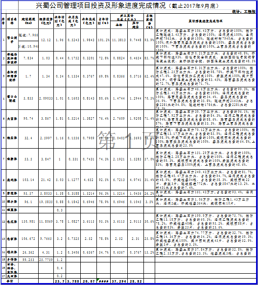 興蜀公司管理項目投資及形象進度完成情況(截止2017年9月底)