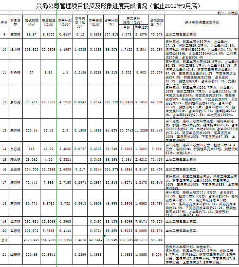 興蜀公司管理項(xiàng)目投資及形象進(jìn)度完成情況(截至2019年9月底)