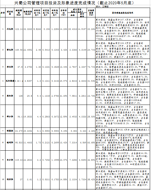 興蜀公司管理項目投資及形象進度完成情況(截至2020年5月底)