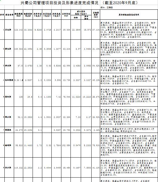 興蜀公司管理項(xiàng)目投資及形象進(jìn)度完成情況(截至2020年9月底)