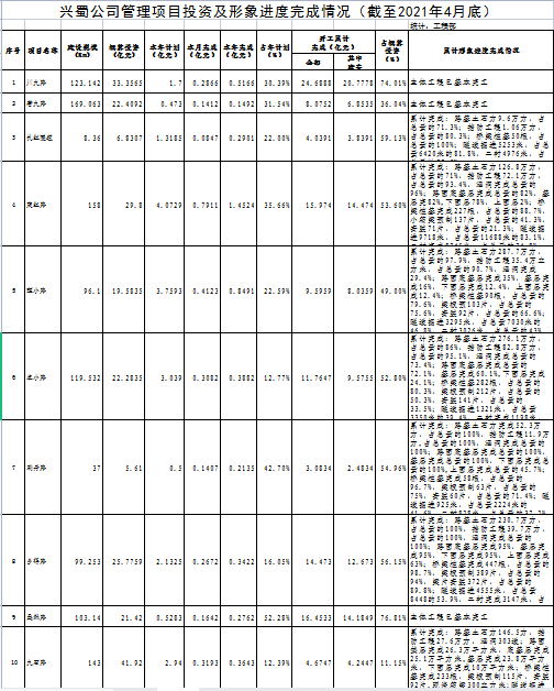 興蜀公司管理項目投資及形象進度完成情況(截至2021年4月底)