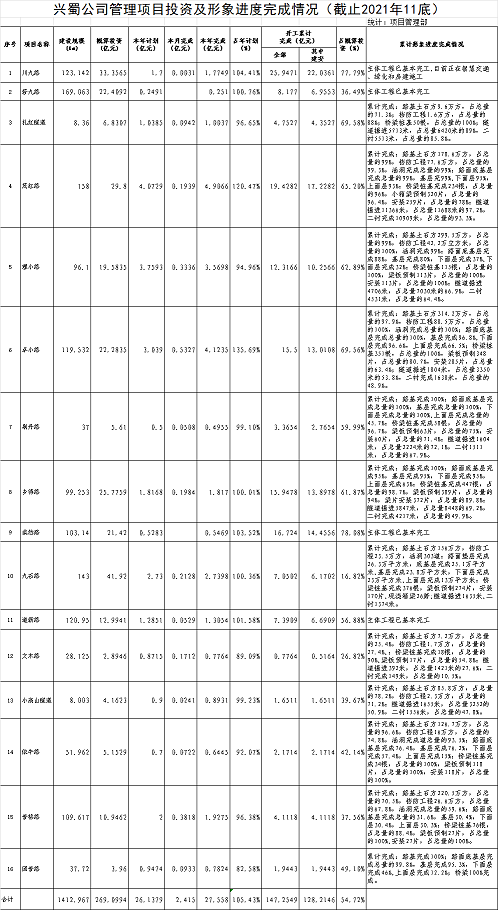 興蜀公司管理項目投資及形象進度完成情況(截止2021年11底)