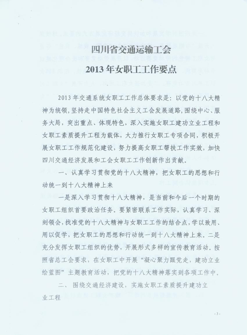 四川省交通運輸工會印發(fā)2013年女職工工作要點,按工會主席批示請各位女職工學(xué)習(xí)文件精神、遵照執(zhí)行。
