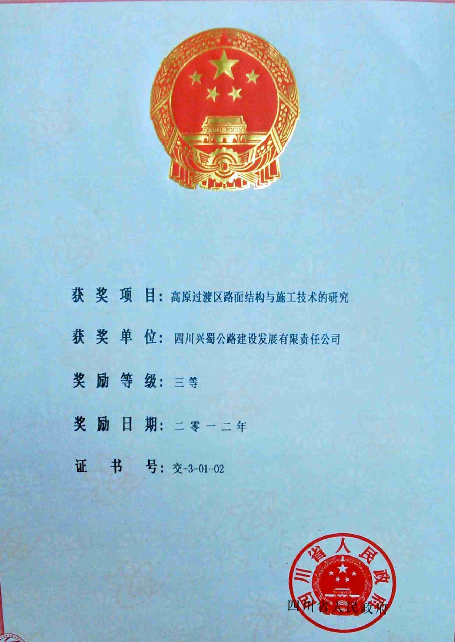 日前,我公司科研課題《高原過渡區(qū)路面結(jié)構(gòu)與施工技術(shù)的研究》,榮獲四川省人民政府2012年度“四川省科技進步獎”三等獎。